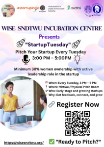 A weekly pitch event hosted at WISE SNDTWU Incubation Centre to give early-stage and growing startups a platform to pitch, receive feedback, and connect.